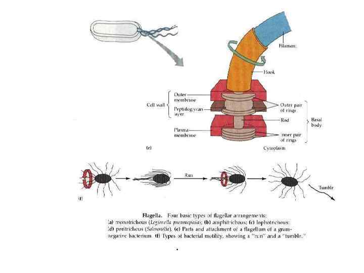 Flagella are long (3 to 12 µm), filamentous surface appendages about 12 to 30 nm in diameter. A flagellum consists of three parts: (1) the long filament, ; (2) the hook structure; and (3) the basal body. Chemically, They are constructed of proteins, called flagellins and numerous of proteins. Function: 1. locomotion ; 2. immunogenic – H (Flagella) antigens Detection: direct method – Loffler staining indirect method –hanging drop and crash drop
