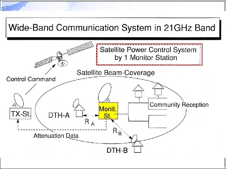 Mitigation Technologies Principle and Feature Examples Static -Margin addition -Hierarchical channel -Waste of Resource -EIRP, G/T increase -Hierarchical coding & modulation Adaptive (Dynami c) Diversity -Adaptive distribution of link Resources -Good for point-to-point -Power control -Bandwidth control -Coding rate control -Prepare channels with low attenuation correlation -Good for large attenuation -Site or/and Time diversity -Frequency diversity -Orbit diversity