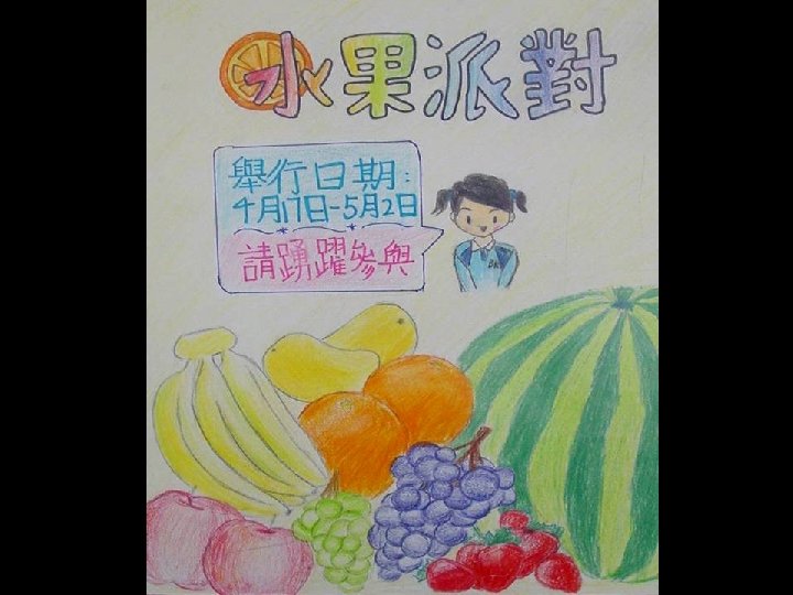 Educate and promote healthy eating Fruit Party was held to promote fruit consumption among students by making it a joyful act. Contents include poster design, introduction of fruit menus, fruit consumption statistic etc. For those students who have reached certain standard, they would be awarded to join the Fruit Party.
