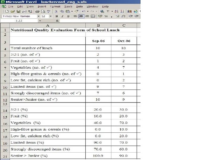 Evaluation – gradual effect Ø School lunch supplier can follow the recommendation by DH supplying 321 lunch increasing vegetable provision Ø With the support of tuckshop, there is significant increase in fruit consumption among students Ø Students show more concern about green food