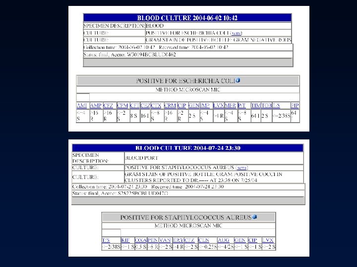 Culture Results • Minimum inhibitory concentration (MIC) – The lowest concentration of drug that prevents visible bacterial growth after 24 hours of incubation in a specified growth medium – Organism and antimicrobial specific – Interpretation » » Pharmacokinetics of the drug in humans Drug’s activity versus the organism Site of infection Drug resistance mechanisms • Report organism(s) and susceptibilities to antimicrobials – Susceptible (S) – Intermediate (I) – Resistant (R)