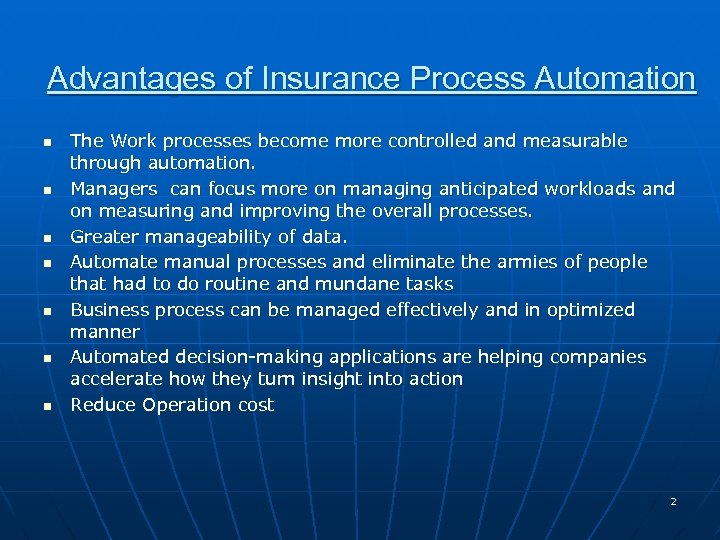 Advantages of Insurance Process Automation n n n The Work processes become more controlled and measurable through automation. Managers can focus more on managing anticipated workloads and on measuring and improving the overall processes. Greater manageability of data. Automate manual processes and eliminate the armies of people that had to do routine and mundane tasks Business process can be managed effectively and in optimized manner Automated decision-making applications are helping companies accelerate how they turn insight into action Reduce Operation cost 2