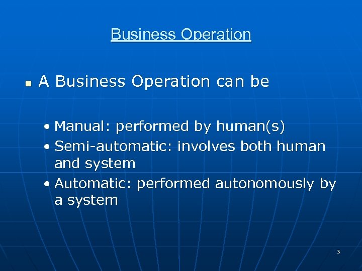 Business Operation n A Business Operation can be • Manual: performed by human(s) • Semi-automatic: involves both human and system • Automatic: performed autonomously by a system 3