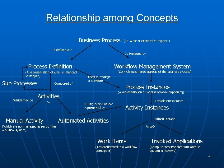 Relationship among Concepts Business Process Is defined in a Is Managed by Process Definition (A representation of what is intended to happen) Sub Processes Which may be Composed of Workflow Management System (Controls automated aspects of the business process) Used to manage and create Process Instances (A representation of what is actually happening) Activities or Manual Activity (i. e. what is intended to happen ) During execution are represented by Include one or more Activity Instances Automated Activities (Which are not managed as part of the workflow system) Which Include And/Or Work Items (Tasks allocated to a workflow participant) Invoked Applications (Computer tools/applications used to support an activity) 4