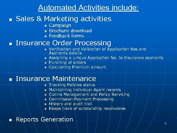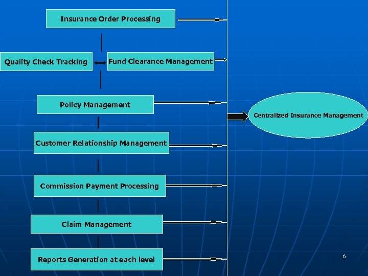 Automated Activities include: n Sales & Marketing activities n n Insurance Order Processing n n n Verification and Validation of Application Nos and Aspirants details Assigning a unique Application No. to Insurance aspirants Punching of orders Calculating Premium amount Insurance Maintenance n n n n Campaign Brochure download Feedback forms Tracking Policies status Maintaining individual Agent records Claims Management and Policy Servicing Commission Payment Processing History and audit trail Keeps track of outstanding receivables Reports Generation 5