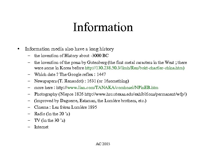 Information • Information media also have a long history – the invention of History about -3000 BC – the invention of the press by Gutenberg (the first metal caracters in the West ; there were some in Korea before http: //130. 238. 50. 3/ilmh/Ren/bokt-chartier-china. htm) – Which date ? The Google reflex : 1447 – Newspapers (T. Renaudot) : 1631 (or 16 something) – more here : http: //www. lian. com/TANAKA/comhosei/NPin. EB. htm – Photography (Niepce 1826 http: //www. hrc. utexas. edu/exhibitions/permanent/wfp/) – (improved by Daguerre, Eatsman, the Lumière brothers, etc. ) – Cinema : Les frères Lumière 1895 – Radio (in the 20 ’s) – TV (in the 30 ’s) – Internet AC 2003