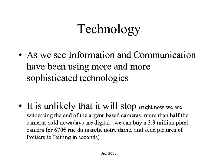 Technology • As we see Information and Communication have been using more and more sophisticated technologies • It is unlikely that it will stop (right now we are witnessing the end of the argent-based cameras, more than half the cameras sold nowadays are digital ; we can buy a 3. 3 million pixel camera for 670€ rue du marché notre dame, and send pictures of Poitiers to Beijing in seconds) AC 2003