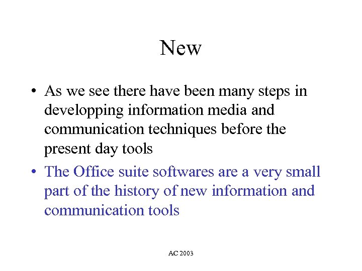 New • As we see there have been many steps in developping information media and communication techniques before the present day tools • The Office suite softwares are a very small part of the history of new information and communication tools AC 2003