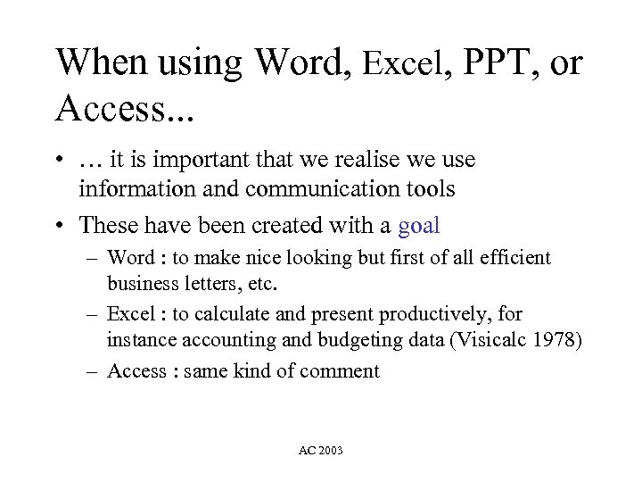When using Word, Excel, PPT, or Access. . . • … it is important that we realise we use information and communication tools • These have been created with a goal – Word : to make nice looking but first of all efficient business letters, etc. – Excel : to calculate and present productively, for instance accounting and budgeting data (Visicalc 1978) – Access : same kind of comment AC 2003