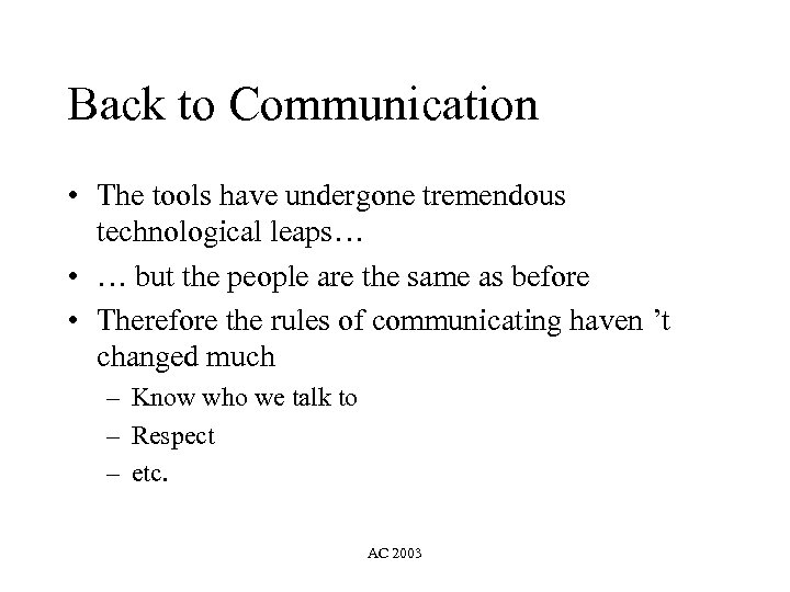 Back to Communication • The tools have undergone tremendous technological leaps… • … but the people are the same as before • Therefore the rules of communicating haven ’t changed much – Know who we talk to – Respect – etc. AC 2003