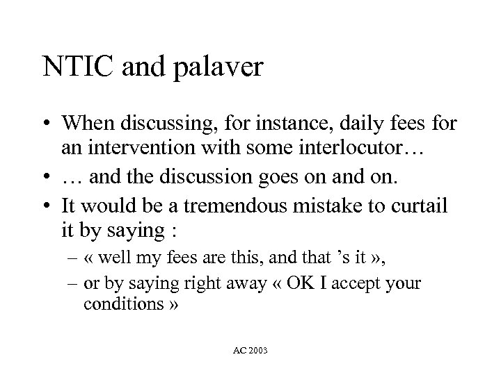 NTIC and palaver • When discussing, for instance, daily fees for an intervention with some interlocutor… • … and the discussion goes on and on. • It would be a tremendous mistake to curtail it by saying : – « well my fees are this, and that ’s it » , – or by saying right away « OK I accept your conditions » AC 2003