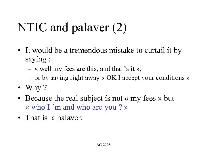 NTIC and palaver (2) • It would be a tremendous mistake to curtail it by saying : – « well my fees are this, and that ’s it » , – or by saying right away « OK I accept your conditions » • Why ? • Because the real subject is not « my fees » but « who I ’m and who are you ? » • That is a palaver. AC 2003