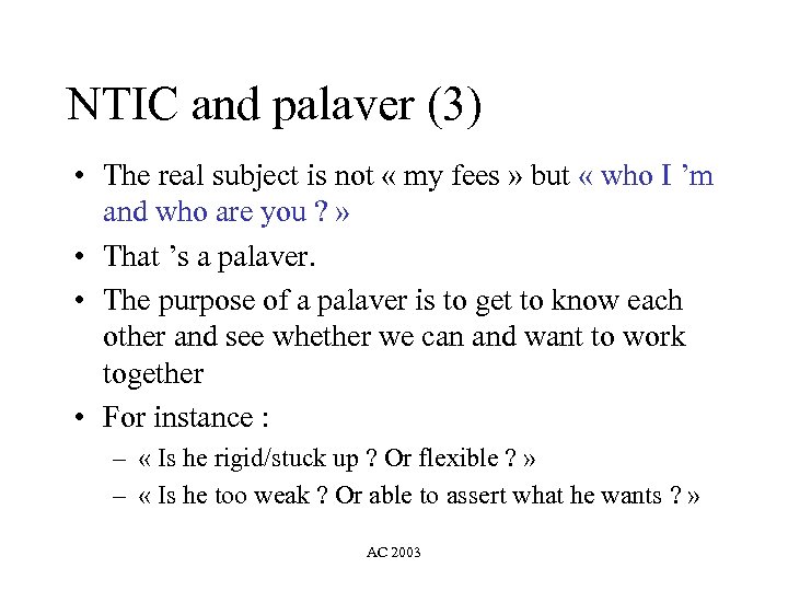NTIC and palaver (3) • The real subject is not « my fees » but « who I ’m and who are you ? » • That ’s a palaver. • The purpose of a palaver is to get to know each other and see whether we can and want to work together • For instance : – « Is he rigid/stuck up ? Or flexible ? » – « Is he too weak ? Or able to assert what he wants ? » AC 2003