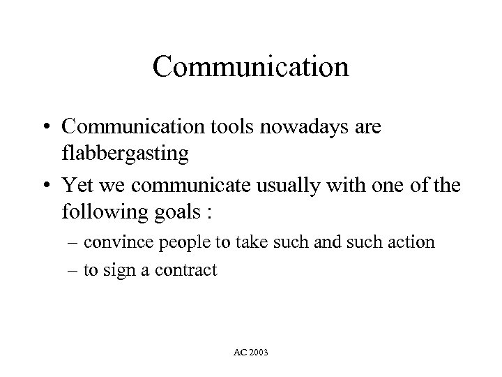 Communication • Communication tools nowadays are flabbergasting • Yet we communicate usually with one of the following goals : – convince people to take such and such action – to sign a contract AC 2003
