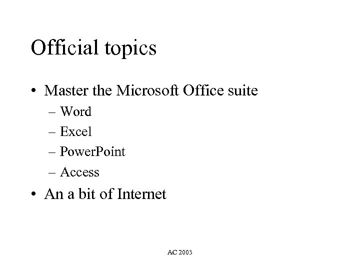 Official topics • Master the Microsoft Office suite – Word – Excel – Power. Point – Access • An a bit of Internet AC 2003