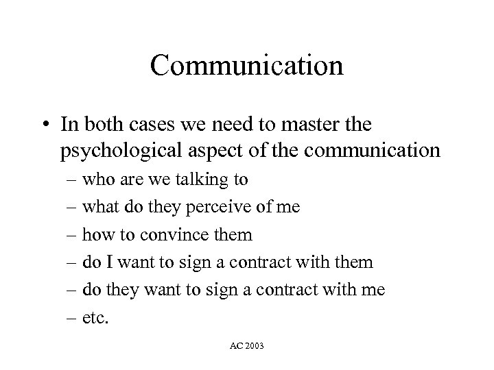 Communication • In both cases we need to master the psychological aspect of the communication – who are we talking to – what do they perceive of me – how to convince them – do I want to sign a contract with them – do they want to sign a contract with me – etc. AC 2003