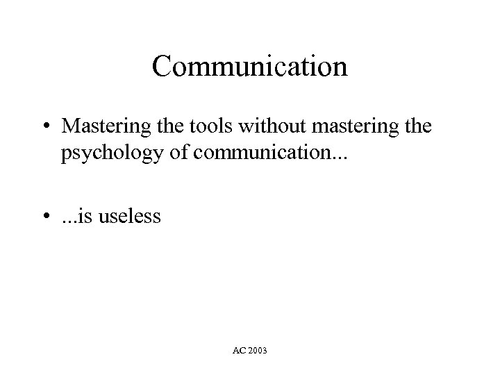 Communication • Mastering the tools without mastering the psychology of communication. . . • . . . is useless AC 2003