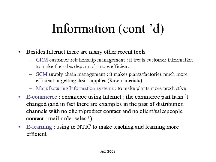 Information (cont ’d) • Besides Internet there are many other recent tools – CRM customer relationship management : it treats customer information to make the sales dept much more efficient – SCM supply chain management : it makes plants/factories much more efficient in getting their supplies (Raw materials) – Manufacturing Information systems : to make plants more productive • E-commerce : commerce using Internet ; the commerce part hasn ’t changed (and in fact there are examples in the past of distribution channels with no client/product contact and no client/salespeople contact : mail order sales !) • E-learning : using to NTIC to make teaching and learning more efficient AC 2003