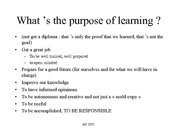 What ’s the purpose of learning ? • (not get a diploma : that ’s only the proof that we learned, that ’s not the goal) • Get a great job – To be well trained, well prepared – to open minded • Prepare for a good future (for ourselves and for what we will have in charge) • Improve our knowledge • To have informed opininons • To be autonomous and creative and not just a « mold-copy » • To be useful • To be accomplished, TO BE RESPONSIBLE AC 2003