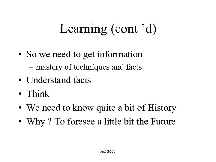 Learning (cont ’d) • So we need to get information – mastery of techniques and facts • • Understand facts Think We need to know quite a bit of History Why ? To foresee a little bit the Future AC 2003