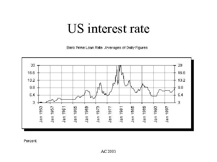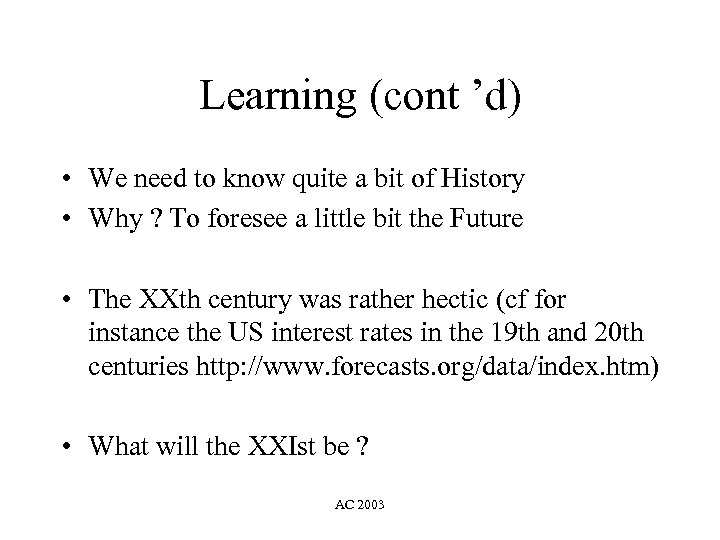 Learning (cont ’d) • We need to know quite a bit of History • Why ? To foresee a little bit the Future • The XXth century was rather hectic (cf for instance the US interest rates in the 19 th and 20 th centuries http: //www. forecasts. org/data/index. htm) • What will the XXIst be ? AC 2003