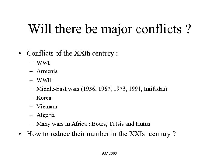 Will there be major conflicts ? • Conflicts of the XXth century : – – – – WWI Armenia WWII Middle-East wars (1956, 1967, 1973, 1991, Intifadas) Korea Vietnam Algeria Many wars in Africa : Boers, Tutsis and Hutus • How to reduce their number in the XXIst century ? AC 2003