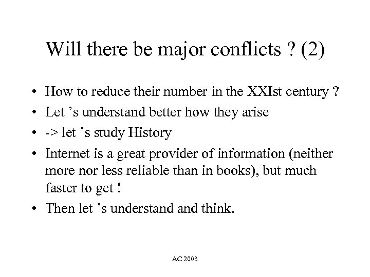 Will there be major conflicts ? (2) • • How to reduce their number in the XXIst century ? Let ’s understand better how they arise -> let ’s study History Internet is a great provider of information (neither more nor less reliable than in books), but much faster to get ! • Then let ’s understand think. AC 2003