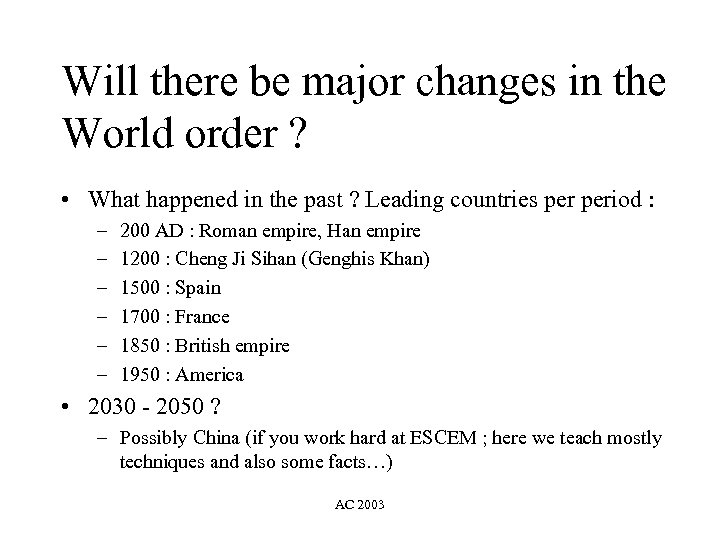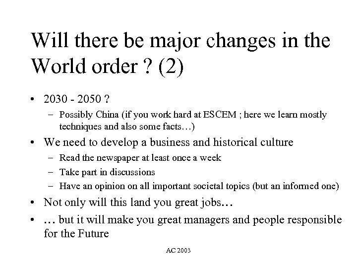 Will there be major changes in the World order ? (2) • 2030 - 2050 ? – Possibly China (if you work hard at ESCEM ; here we learn mostly techniques and also some facts…) • We need to develop a business and historical culture – Read the newspaper at least once a week – Take part in discussions – Have an opinion on all important societal topics (but an informed one) • Not only will this land you great jobs… • … but it will make you great managers and people responsible for the Future AC 2003