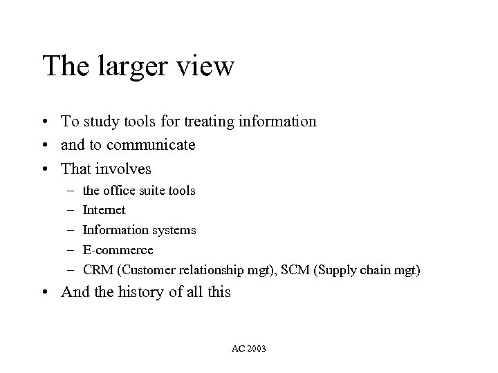 The larger view • To study tools for treating information • and to communicate • That involves – – – the office suite tools Internet Information systems E-commerce CRM (Customer relationship mgt), SCM (Supply chain mgt) • And the history of all this AC 2003