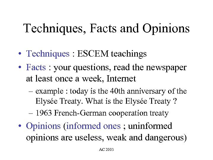 Techniques, Facts and Opinions • Techniques : ESCEM teachings • Facts : your questions, read the newspaper at least once a week, Internet – example : today is the 40 th anniversary of the Elysée Treaty. What is the Elysée Treaty ? – 1963 French-German cooperation treaty • Opinions (informed ones ; uninformed opinions are useless, weak and dangerous) AC 2003