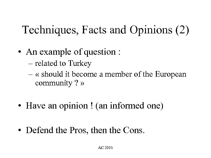 Techniques, Facts and Opinions (2) • An example of question : – related to Turkey – « should it become a member of the European community ? » • Have an opinion ! (an informed one) • Defend the Pros, then the Cons. AC 2003