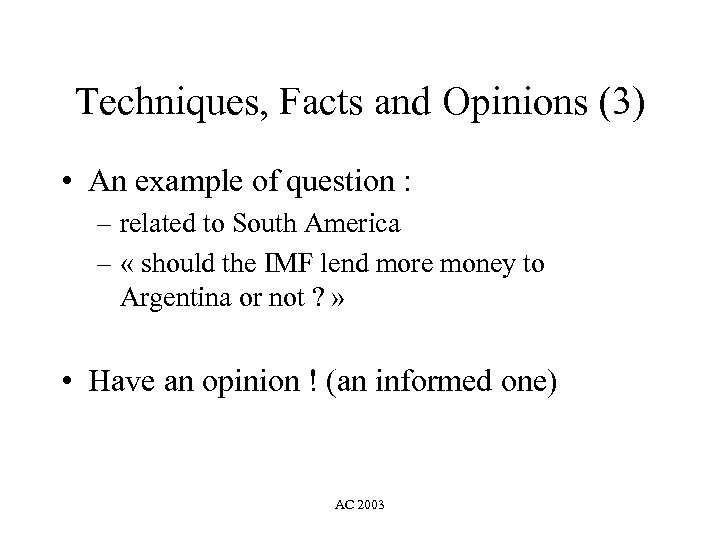 Techniques, Facts and Opinions (3) • An example of question : – related to South America – « should the IMF lend more money to Argentina or not ? » • Have an opinion ! (an informed one) AC 2003