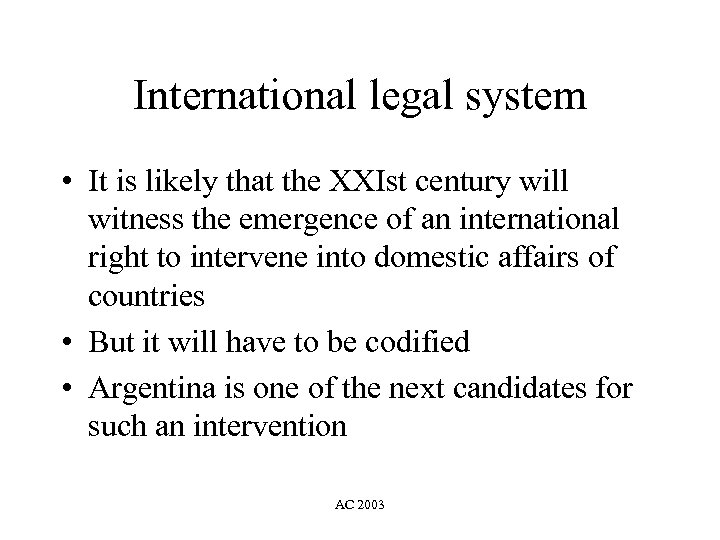 International legal system • It is likely that the XXIst century will witness the emergence of an international right to intervene into domestic affairs of countries • But it will have to be codified • Argentina is one of the next candidates for such an intervention AC 2003