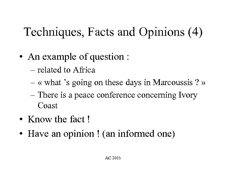 Techniques, Facts and Opinions (4) • An example of question : – related to Africa – « what ’s going on these days in Marcoussis ? » – There is a peace conference concerning Ivory Coast • Know the fact ! • Have an opinion ! (an informed one) AC 2003