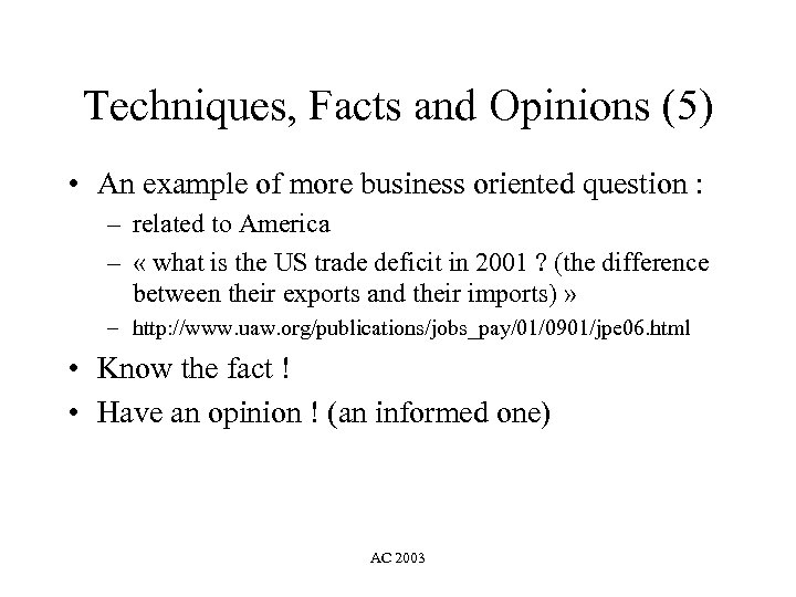 Techniques, Facts and Opinions (5) • An example of more business oriented question : – related to America – « what is the US trade deficit in 2001 ? (the difference between their exports and their imports) » – http: //www. uaw. org/publications/jobs_pay/01/0901/jpe 06. html • Know the fact ! • Have an opinion ! (an informed one) AC 2003
