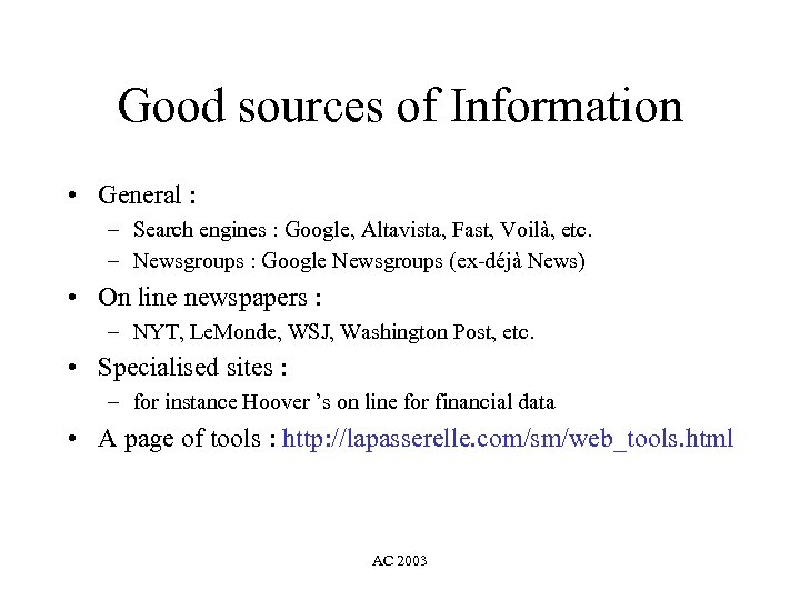 Good sources of Information • General : – Search engines : Google, Altavista, Fast, Voilà, etc. – Newsgroups : Google Newsgroups (ex-déjà News) • On line newspapers : – NYT, Le. Monde, WSJ, Washington Post, etc. • Specialised sites : – for instance Hoover ’s on line for financial data • A page of tools : http: //lapasserelle. com/sm/web_tools. html AC 2003