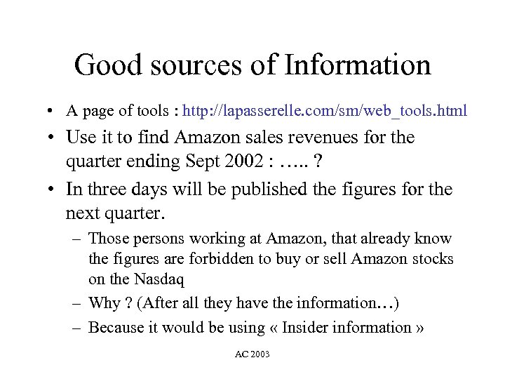 Good sources of Information • A page of tools : http: //lapasserelle. com/sm/web_tools. html • Use it to find Amazon sales revenues for the quarter ending Sept 2002 : …. . ? • In three days will be published the figures for the next quarter. – Those persons working at Amazon, that already know the figures are forbidden to buy or sell Amazon stocks on the Nasdaq – Why ? (After all they have the information…) – Because it would be using « Insider information » AC 2003