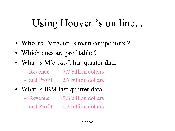 Using Hoover ’s on line. . . • Who are Amazon ’s main competitors ? • Which ones are profitable ? • What is Microsoft last quarter data – Revenue 7. 7 billion dollars – and Profit 2. 7 billion dollars • What is IBM last quarter data – Revenue 19. 8 billion dollars – and Profit 1. 3 billion dollars AC 2003