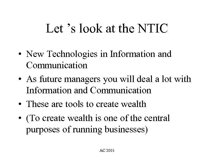 Let ’s look at the NTIC • New Technologies in Information and Communication • As future managers you will deal a lot with Information and Communication • These are tools to create wealth • (To create wealth is one of the central purposes of running businesses) AC 2003