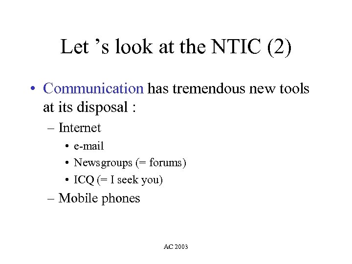 Let ’s look at the NTIC (2) • Communication has tremendous new tools at its disposal : – Internet • e-mail • Newsgroups (= forums) • ICQ (= I seek you) – Mobile phones AC 2003