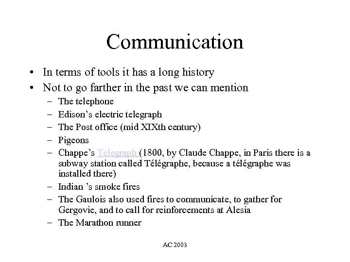 Communication • In terms of tools it has a long history • Not to go farther in the past we can mention – – – The telephone Edison’s electric telegraph The Post office (mid XIXth century) Pigeons Chappe’s Telegraph (1800, by Claude Chappe, in Paris there is a subway station called Télégraphe, because a télégraphe was installed there) – Indian ’s smoke fires – The Gaulois also used fires to communicate, to gather for Gergovie, and to call for reinforcements at Alesia – The Marathon runner AC 2003