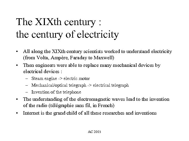 The XIXth century : the century of electricity • All along the XIXth century scientists worked to understand electricity (from Volta, Ampère, Faraday to Maxwell) • Then engineers were able to replace many mechanical devices by electrical devices : – Steam engine -> electric motor – Mechanical/optical telegraph -> electrical telegraph – Invention of the telephone • The understanding of the electromagnetic waves lead to the invention of the radio (télégraphie sans fil, in French) • Internet is the grand child of all these researches and inventions AC 2003