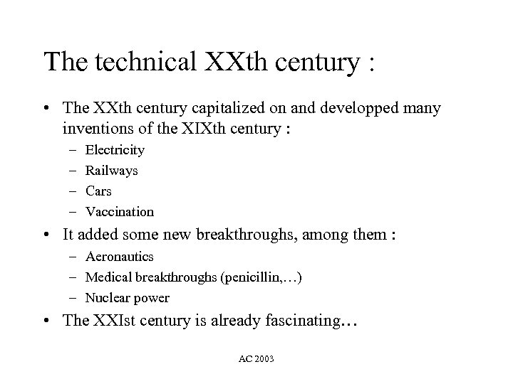 The technical XXth century : • The XXth century capitalized on and developped many inventions of the XIXth century : – – Electricity Railways Cars Vaccination • It added some new breakthroughs, among them : – Aeronautics – Medical breakthroughs (penicillin, …) – Nuclear power • The XXIst century is already fascinating… AC 2003