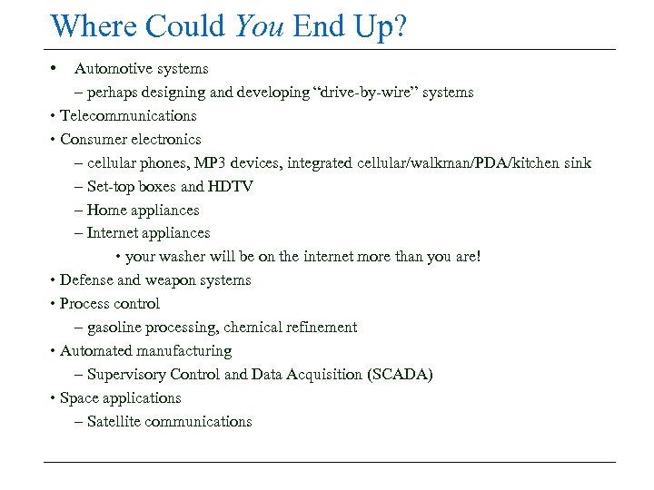 Where Could You End Up? • Automotive systems – perhaps designing and developing “drive-by-wire” systems • Telecommunications • Consumer electronics – cellular phones, MP 3 devices, integrated cellular/walkman/PDA/kitchen sink – Set-top boxes and HDTV – Home appliances – Internet appliances • your washer will be on the internet more than you are! • Defense and weapon systems • Process control – gasoline processing, chemical refinement • Automated manufacturing – Supervisory Control and Data Acquisition (SCADA) • Space applications – Satellite communications