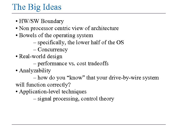 The Big Ideas • HW/SW Boundary • Non processor centric view of architecture • Bowels of the operating system – specifically, the lower half of the OS – Concurrency • Real-world design – performance vs. cost tradeoffs • Analyzability – how do you “know” that your drive-by-wire system will function correctly? • Application-level techniques – signal processing, control theory