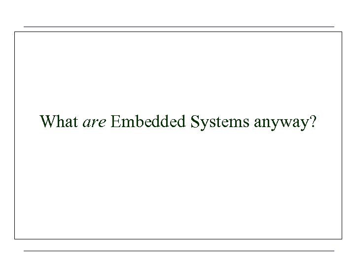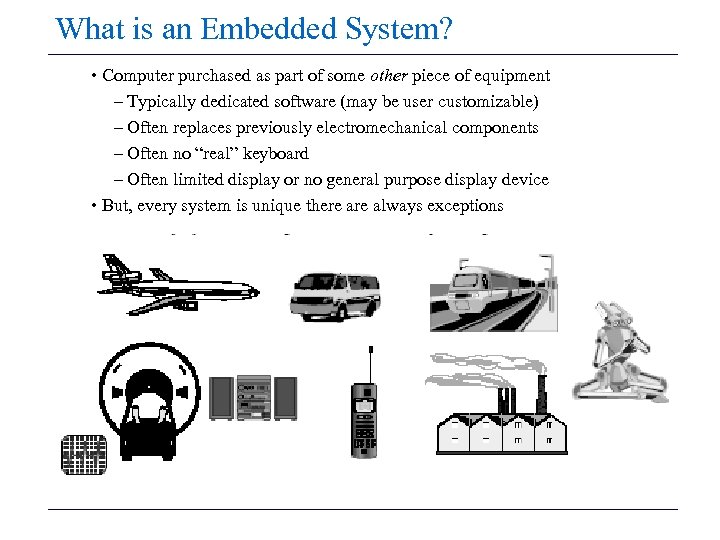 What are Embedded Systems? • Anything that uses a microprocessor but isn't a general-purpose computer – PDAs – Set-top boxes – Televisions – Video Games – Refrigerators – Cars – Planes – Elevators – Remote Controls – Alarm Systems • The user “sees” a smart (special-purpose) system as opposed to the computer inside the system • “how does it do that? ” • “it has a computer inside it!” • “oh! BTW, it does not or cannot run Windows or Mac. OS!” – the end-user typically does not or cannot modify or upgrade the internals