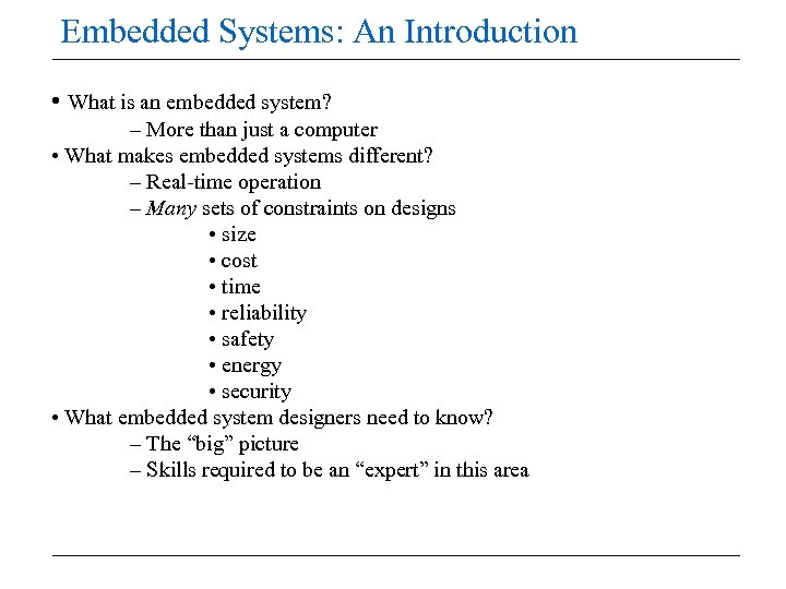 Embedded Systems: An Introduction • What is an embedded system? – More than just a computer • What makes embedded systems different? – Real-time operation – Many sets of constraints on designs • size • cost • time • reliability • safety • energy • security • What embedded system designers need to know? – The “big” picture – Skills required to be an “expert” in this area