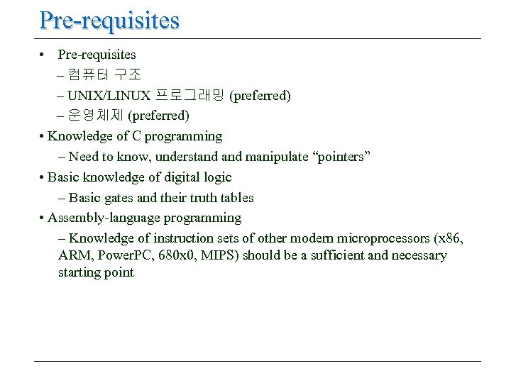 Pre-requisites • Pre-requisites – 컴퓨터 구조 – UNIX/LINUX 프로그래밍 (preferred) – 운영체제 (preferred) • Knowledge of C programming – Need to know, understand manipulate “pointers” • Basic knowledge of digital logic – Basic gates and their truth tables • Assembly-language programming – Knowledge of instruction sets of other modern microprocessors (x 86, ARM, Power. PC, 680 x 0, MIPS) should be a sufficient and necessary starting point