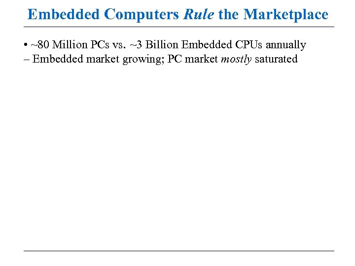 Embedded Computers Rule the Marketplace • ~80 Million PCs vs. ~3 Billion Embedded CPUs annually – Embedded market growing; PC market mostly saturated