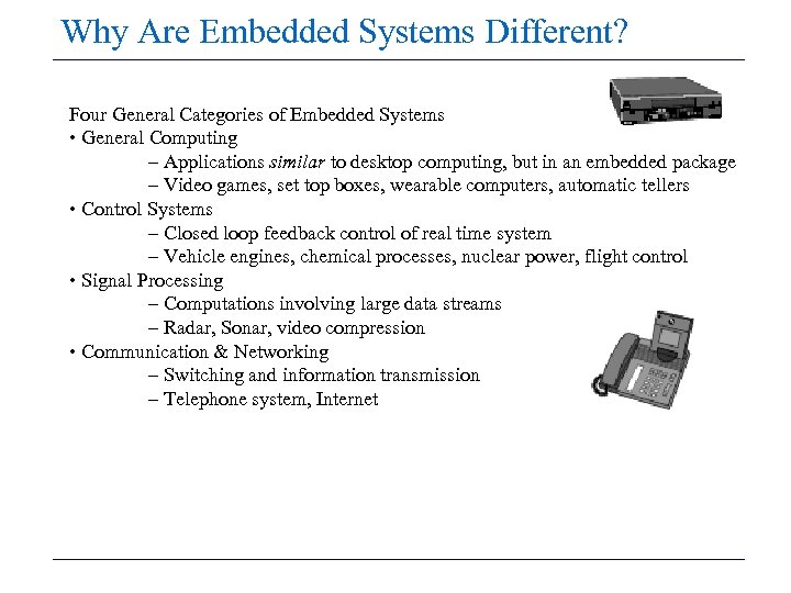 Why Are Embedded Systems Different? Four General Categories of Embedded Systems • General Computing – Applications similar to desktop computing, but in an embedded package – Video games, set top boxes, wearable computers, automatic tellers • Control Systems – Closed loop feedback control of real time system – Vehicle engines, chemical processes, nuclear power, flight control • Signal Processing – Computations involving large data streams – Radar, Sonar, video compression • Communication & Networking – Switching and information transmission – Telephone system, Internet